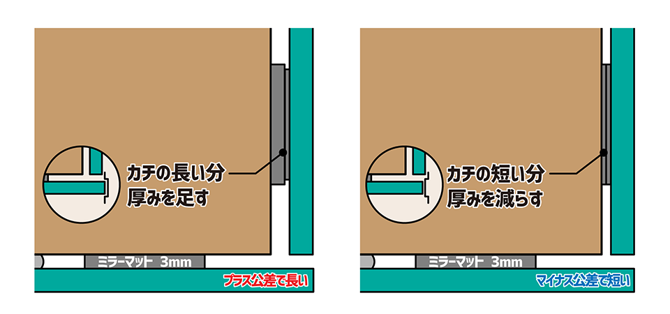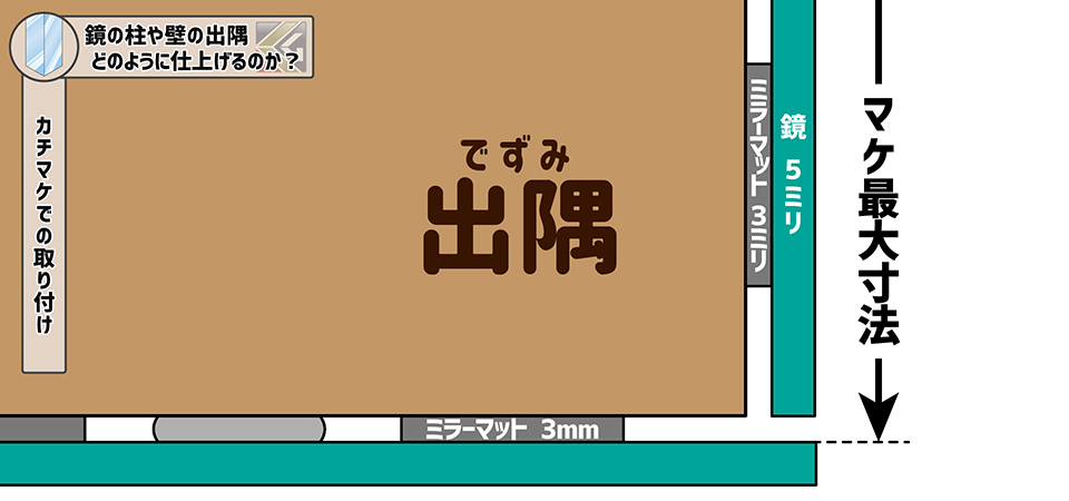 柱寸法にミラーマットの厚み3mm分を足した数値がマケ側の最大寸法となり、そこから数ミリ小さくして隙間を確保します。