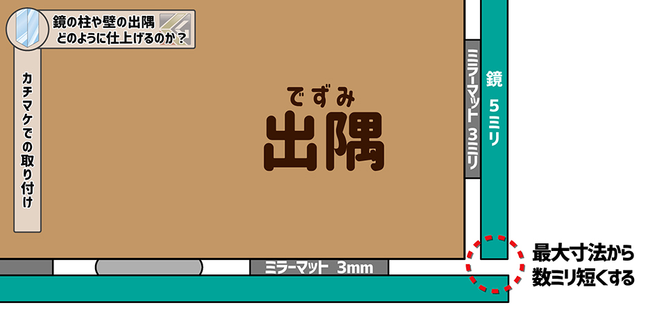 通常貼り付ける鏡の厚み5mmミラーマットの厚み3mmと合計すると出隅から鏡の前面までが8mmとなるため、ガラス面よりもコーナーエッジの方が前に飛び出します。