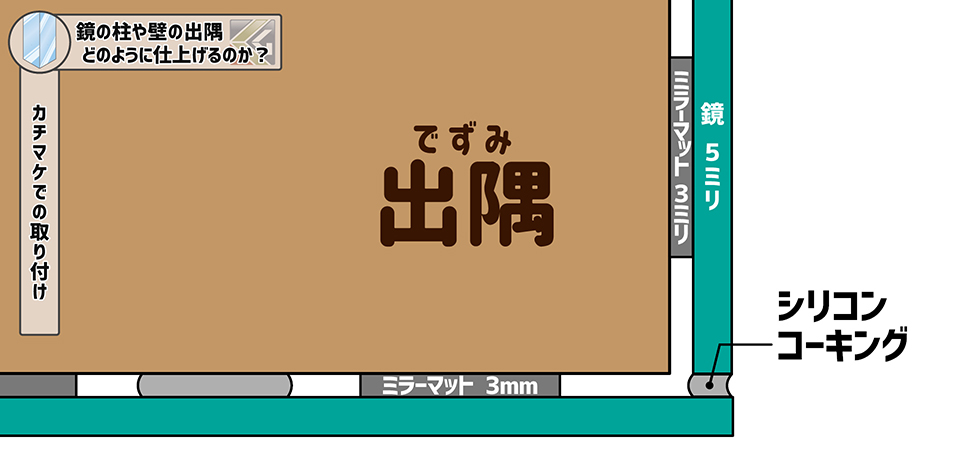 カチマケとは、出隅に貼り付けるミラーのどちらか一方を伸ばして反対側を短くすることで仕上げる方法です。