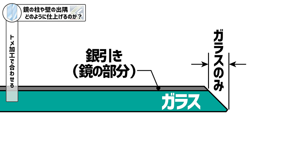 トメ加工をしたミラーは裏の銀引き(鏡の部分)もカットするため部分的に鏡の機能を喪失します。