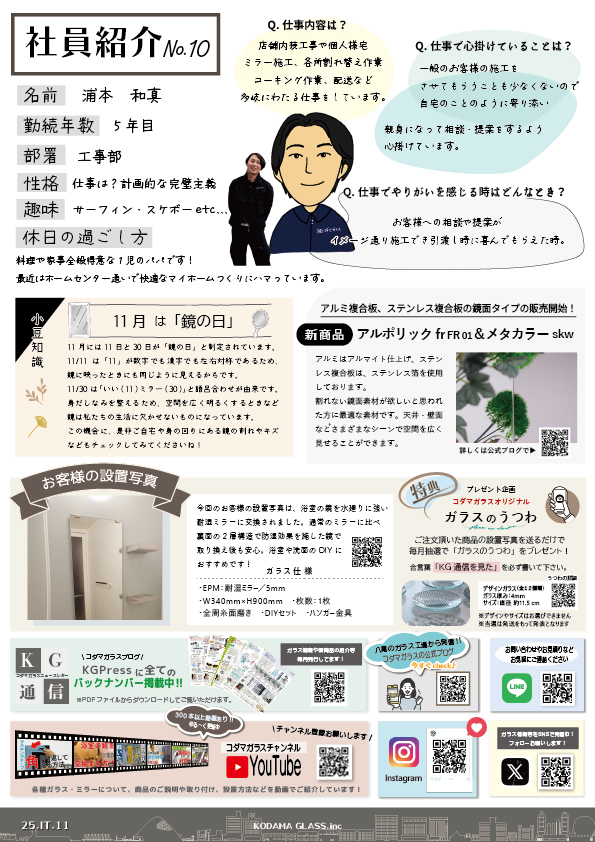 コダマガラスでは、現在書いているこちらのブログ「KGPress」をはじめ、YouTubeやInstagram、Xなどでガラスやミラーに関することを発信しております。