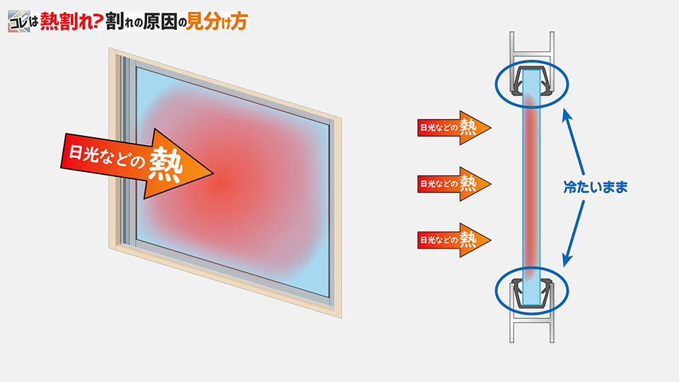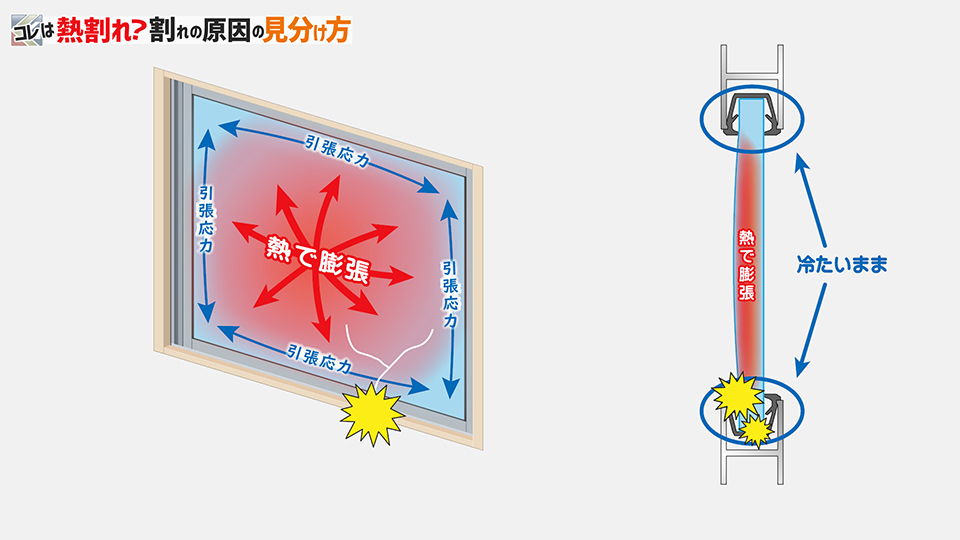 中央部分は温まり熱による膨張が発生しやすいのに対し、サッシ部分は冷えたままなので大きさが変わらないです。