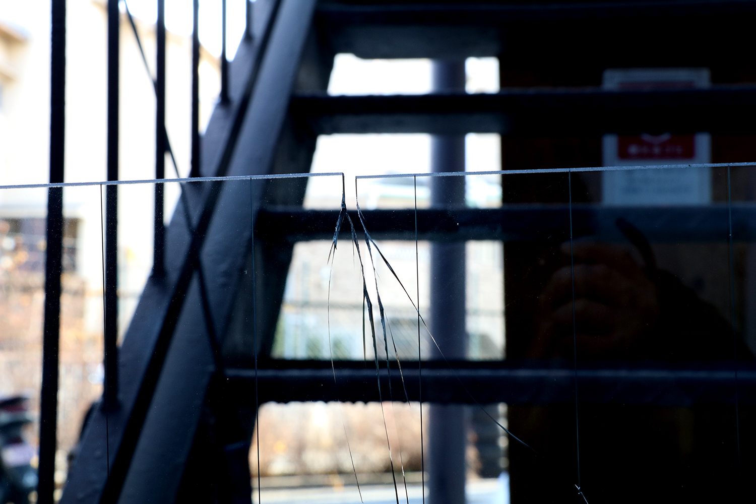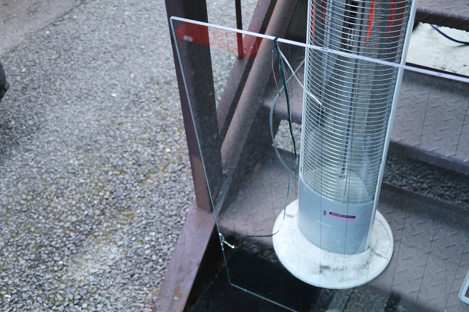 2月の午前中に電気ヒーターをガラスのすぐ傍に置き、ガラスを温めたところ次々とガラスが割れました。